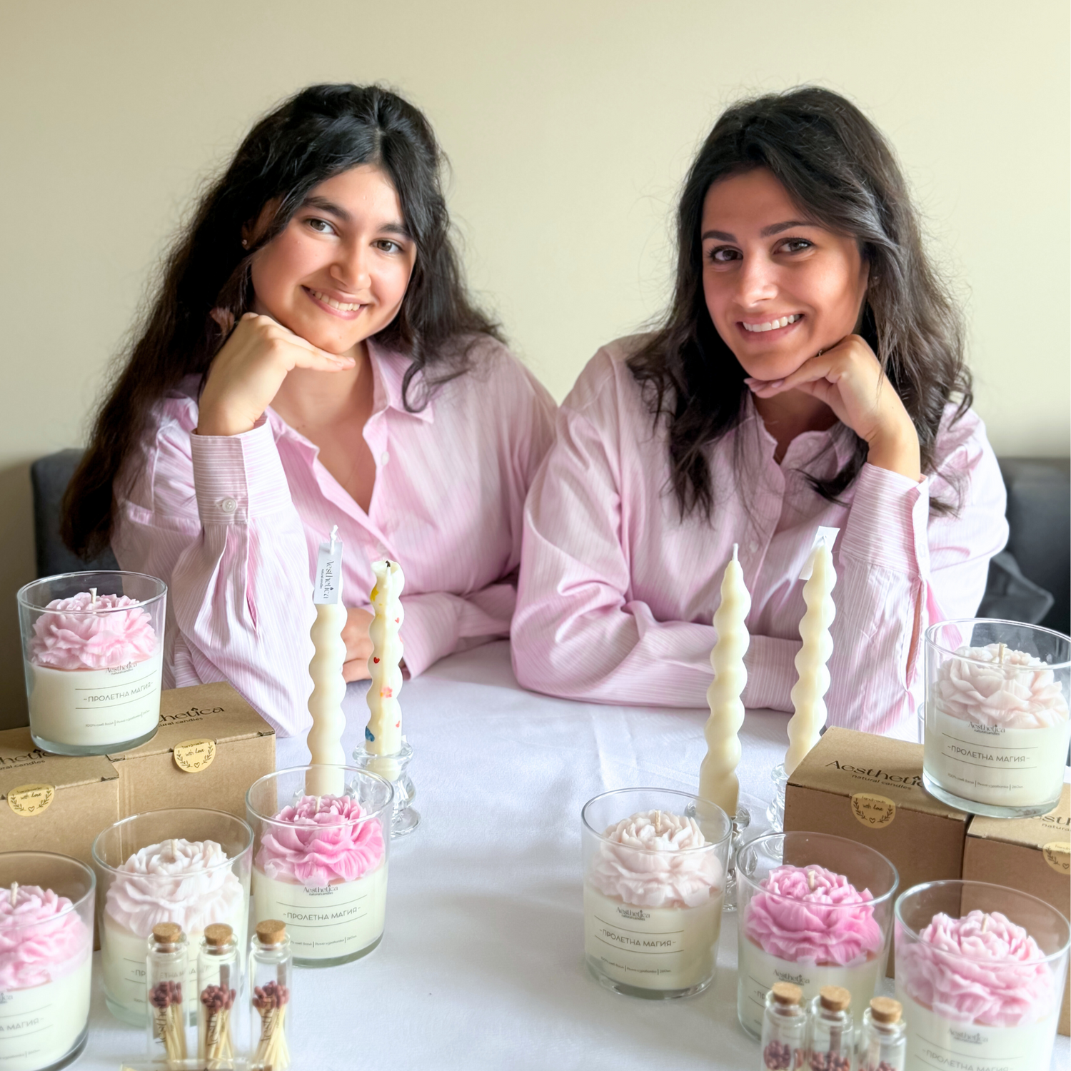 Здравей! Ние сме две сестри – Вяра и Надежда. Създадохме Aesthetica Candles с желание да направим нещо свое – нещо, което вдъхновява, носи уют и създава емоции. Вярваме, че красотата не трябва да бъде за сметка на здравето или природата. Затова всяка наша свещ е изработена с чисти, натурални съставки и много любов.