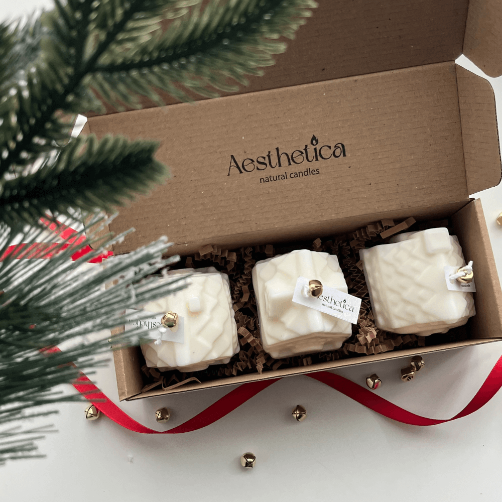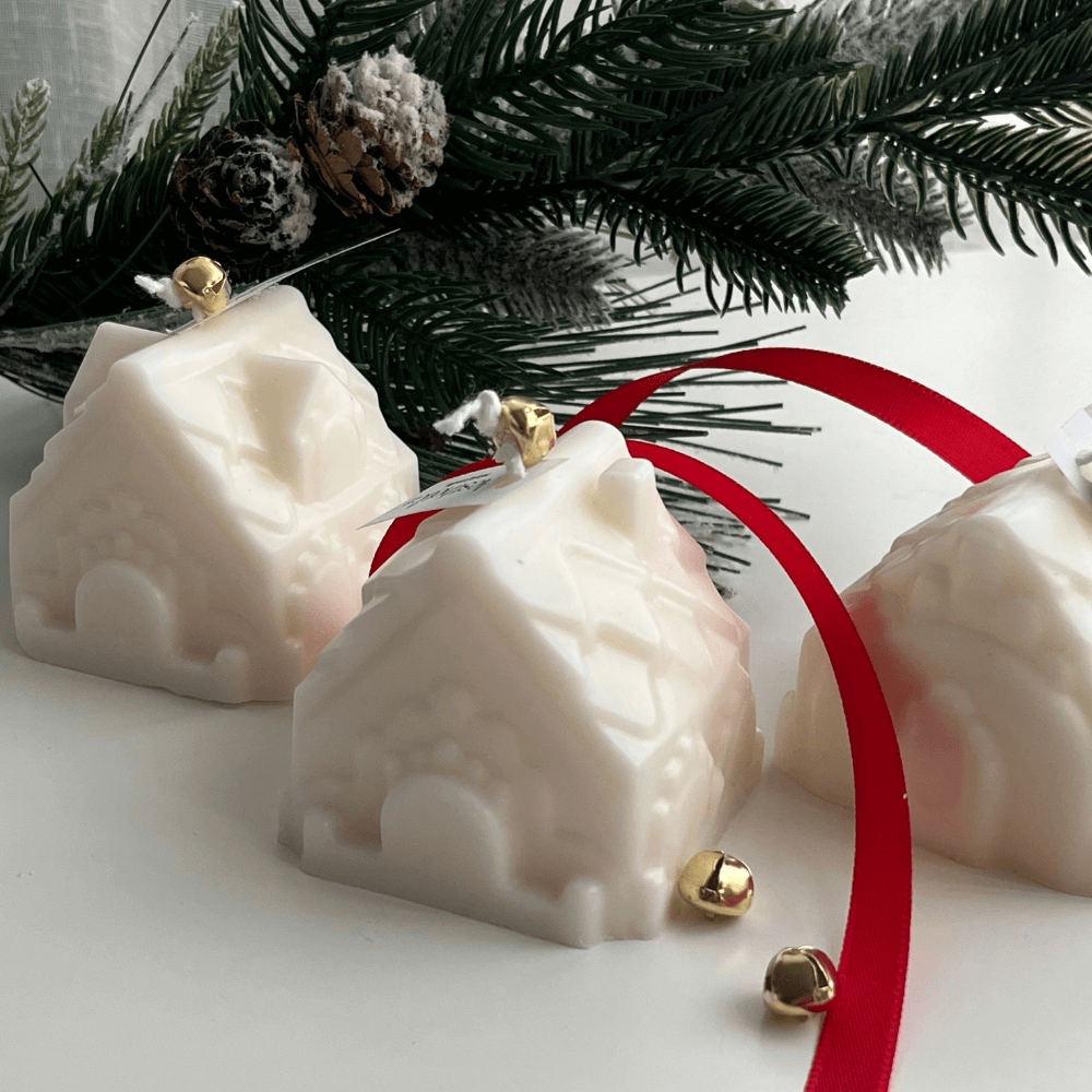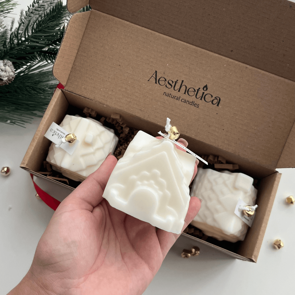 Комплектът от три соеви свещи къщички, изработени от сертифицирани и щадящи природата съставки, е идеален като коледен подарък или като фин акцент в декора на вашия дом.