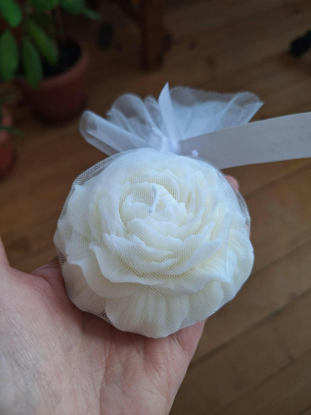 Свободностоящата свещ в тюл е нежният акцент на всяко събитие. Ръчно изработена с грижа и чисти, натурални съставки.