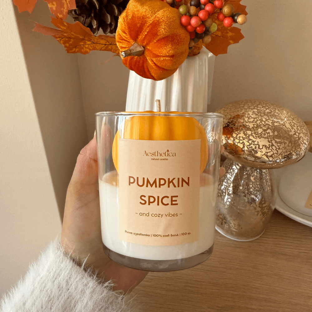 Ръчно изработена от 100% соев восък и безвредни сертифицирани аромати, свещ Pumpkin е създадена с грижа за вас и за природата. Горенето ѝ е чисто и без токсини, за да се насладите само на меката светлина и нежния есенен аромат.