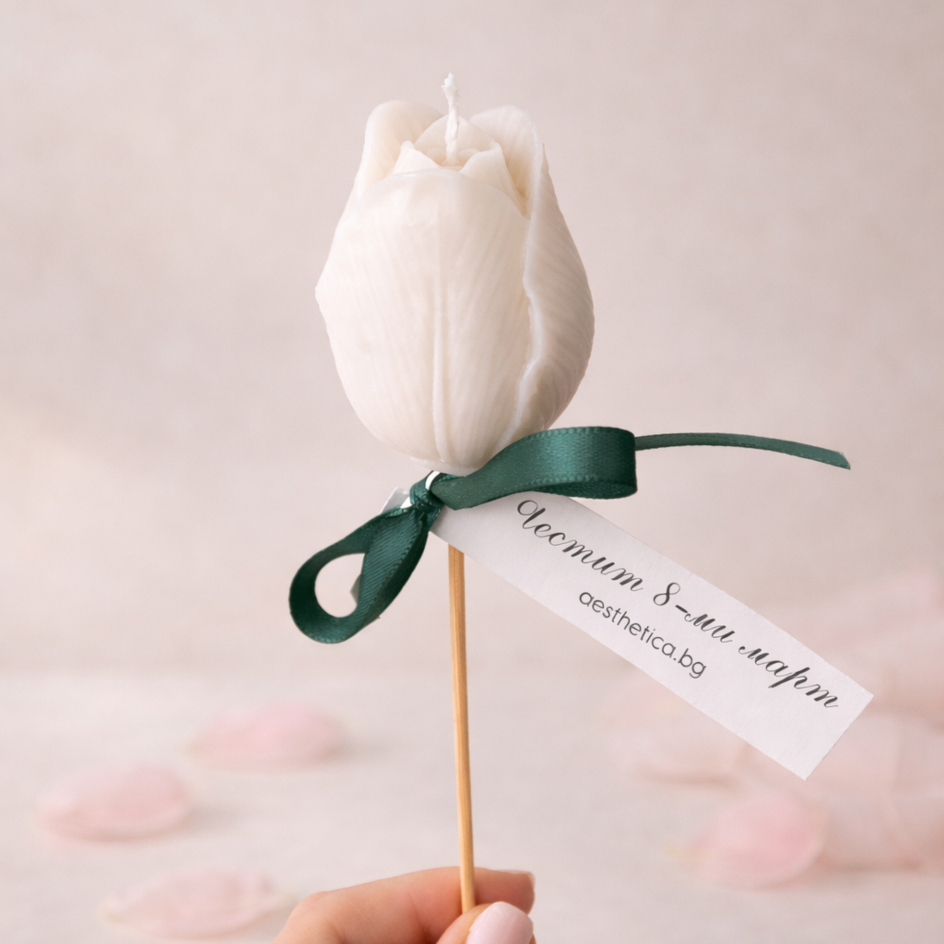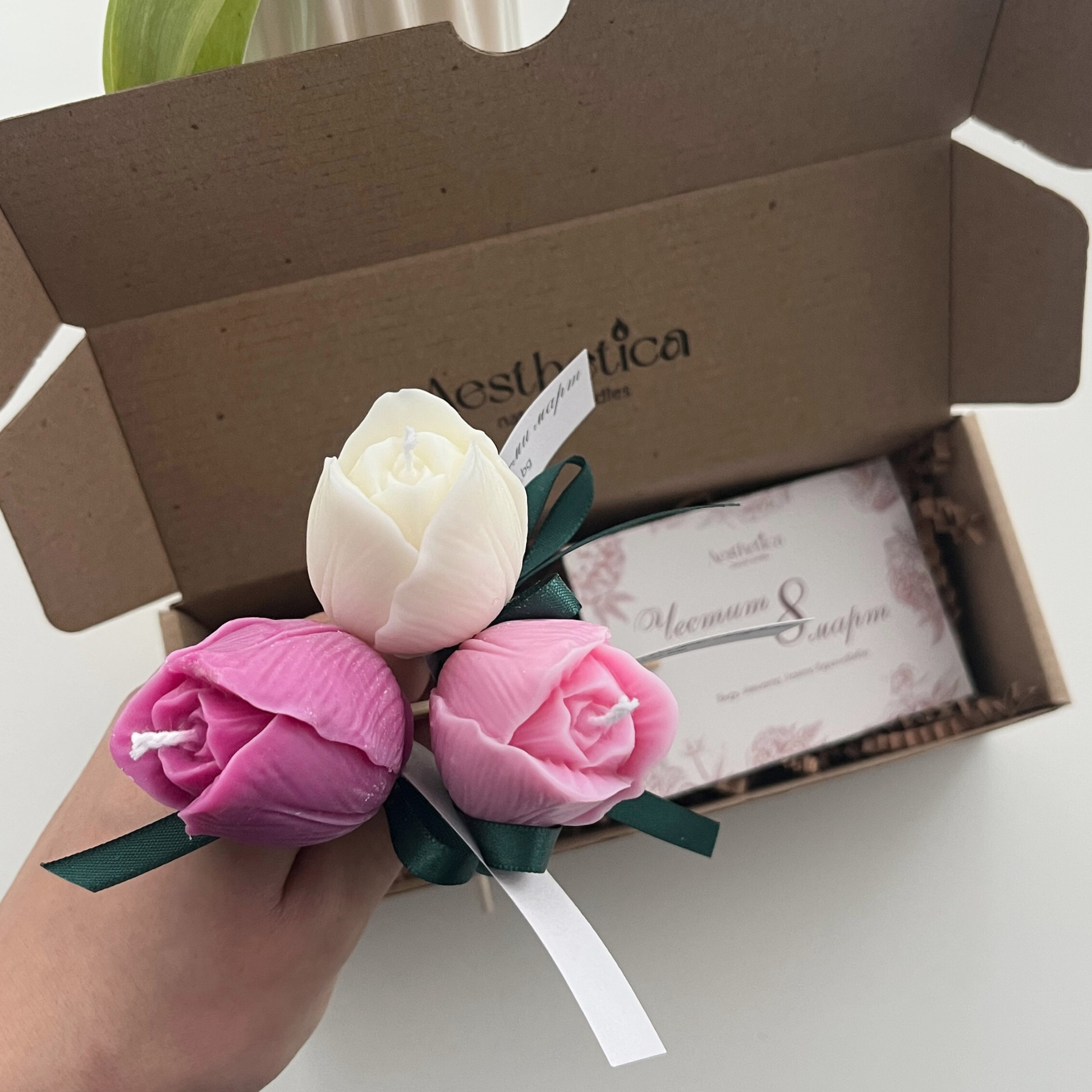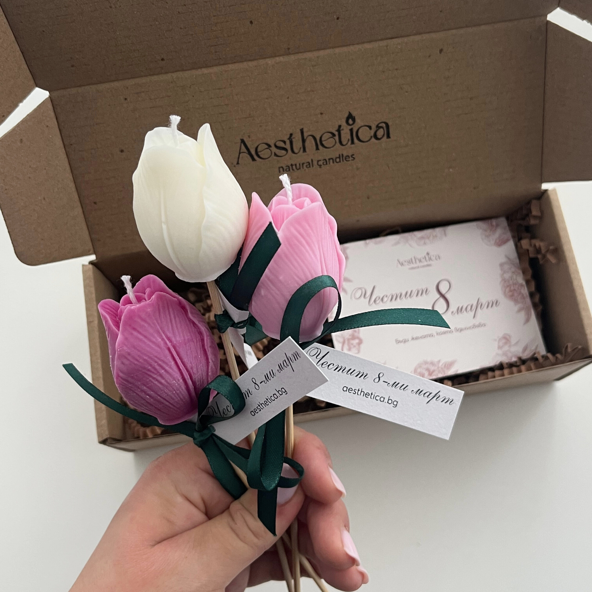 Всяко лале пристига в стилна кутийка с послание за 8-ми март и вдъхновяваща картичка с инструкции за безопасно горене на свещта.🌿